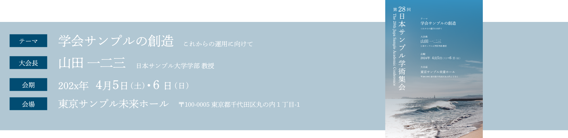 さて、このたび総会長として202x年4月5日,6日に「第28回 日本シンプル学術集会」を〇〇県〇〇市にて開催する運びとなりました。